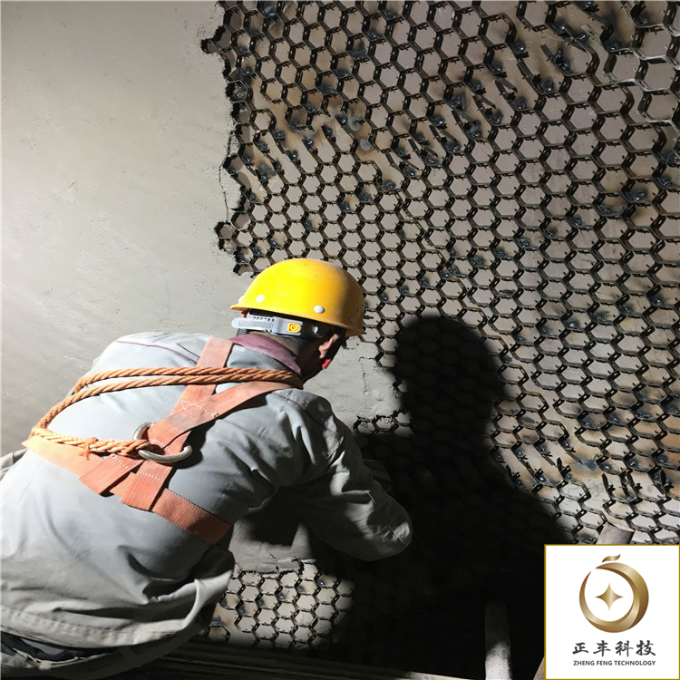 (1)龟甲网焊接:在设备表面上焊接龟甲网,龟甲网采用电弧焊焊接,每个接触骨架空格内双面焊接,焊点间距约20毫米。其焊点抗拉强度平均值:380Mpa抗压强度平均值:560Mpa。