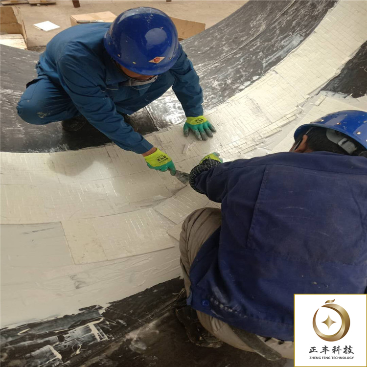 2、刮胶泥:将陶瓷胶和固化剂按比例调配,便于施工可以取200-500克陶瓷胶,放在一个便于和胶的托盘上,然后搅匀,要搅匀,然后把胶刮涂在施工部位上,粘接剂涂抹均匀,不得有漏涂现象,然后把陶瓷片按照顺序粘接到滚筒上。(严格按照工艺比例混胶,并混合均匀;每次混胶量以随用随配为原则),注意:陶瓷片在刮胶前要检查表面毛刺,并清理表面污物。